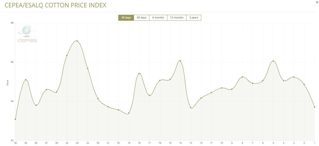 11月21日(周五),巴西CEPEA/ESALQ棉花價(jià)格指數(shù)報(bào)63.85美分/磅,較前一交易日下跌0.90%,較上月同期下降1.10%。