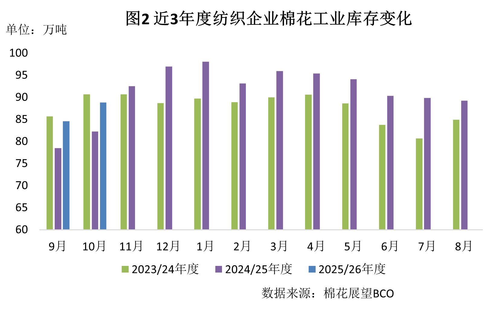 新棉大量上市,市場上可選資源增多,有補(bǔ)庫需求的紡紗廠開始采購,原料庫存有所上升。截至10月底紡織廠在庫棉花工業(yè)庫存量為88.8萬噸,較上月底增加4.3萬噸。紡織廠可支配棉花庫存量為106.7萬噸,較上月底增加3.4萬噸。其中:38%企業(yè)增加棉花庫存,16%減少,46%基本保持不變。盡管新棉供應(yīng)充足,但隨著下游即將進(jìn)入傳統(tǒng)淡季,企業(yè)補(bǔ)庫持續(xù)性仍需觀察。