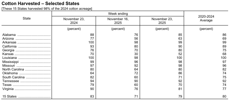 美國農(nóng)業(yè)部(USDA)在每周作物生長報告中公布稱,截至2025年11月23日當周,美國棉花收割率為79%,前周為71%,去年同期為83%,五年均值為80%。