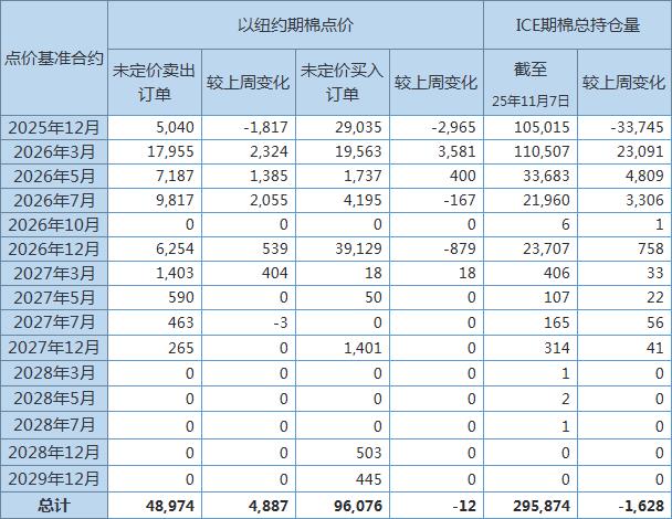 美國商品期貨交易委員會(CFTC)公布,截至11月7日,以ICE期棉2025年12月合約點價未定價賣出訂單(UnfixedCallSales)較前周增加539手至6254手。