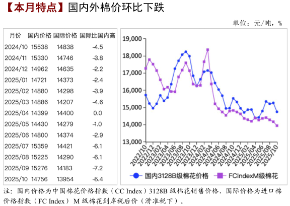 (二)國際棉價連續(xù)4個月下跌。10月,北半球新棉集中上市,階段性供應壓力增大。受美國聯(lián)邦政府“停擺”帶來的市場信息滯后影響,國際棉市缺乏明確指引,市場觀望情緒濃厚,國際棉價繼續(xù)下跌。10月CotlookA指數(相當于國內3128B級棉花)月均價每磅75.87美分,環(huán)比跌2.7%,同比跌9.4%。