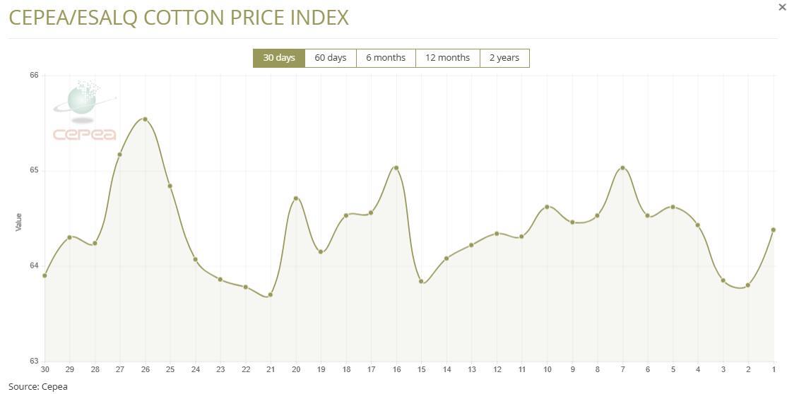 11月25日(周二),巴西CEPEA/ESALQ棉花價(jià)格指數(shù)報(bào)64.38美分/磅,較前一交易日下跌0.91%,較上月同期下降0.28%。