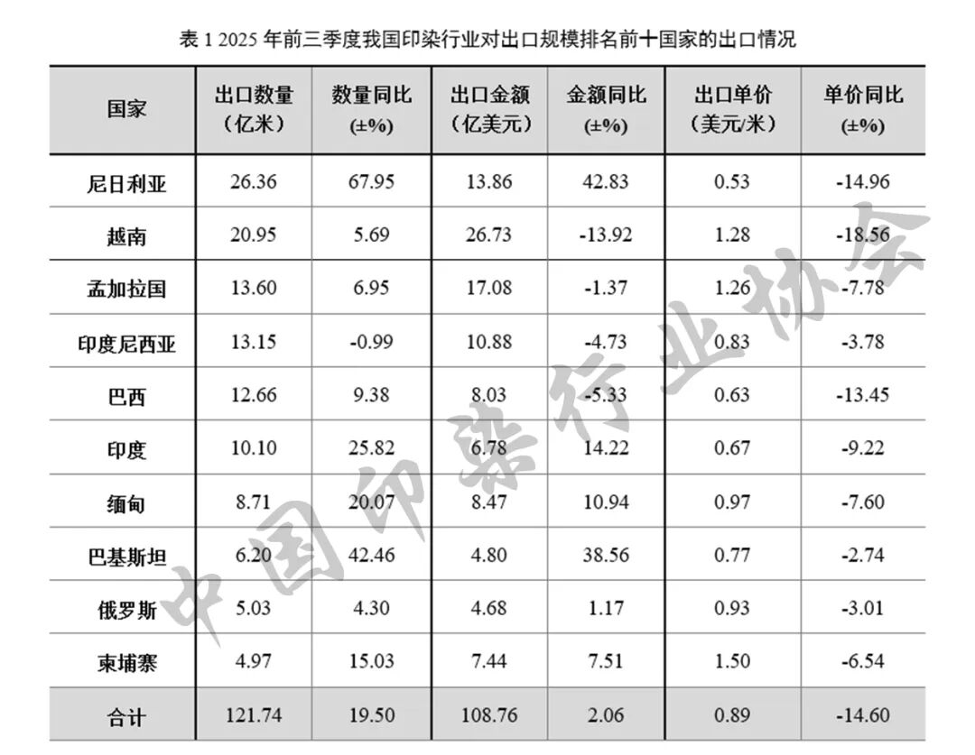 面對復(fù)雜的全球貿(mào)易環(huán)境,我國印染廠積極調(diào)整產(chǎn)品結(jié)構(gòu),持續(xù)拓展“一帶一路”沿線國家和非洲等國際市場。前3季度我國印染行業(yè)出口規(guī)模排名前十的國家出口數(shù)量121.74億米,同比增長19.50%,高于整體增速7.20個百分點,其中對尼日利亞、巴基斯坦、印度出口數(shù)量分別大幅增長67.95%、42.46%、25.82%,對緬甸和柬埔寨出口數(shù)量增速均高于對全球出口整體增速。對前十國家的出口平均單價降幅高于整體水平3.81個百分點,其中對越南、尼日利亞、巴西出口平均單價降幅分別達到18.56%、14.96%、13.45%。