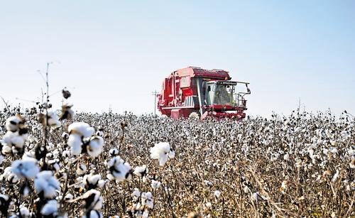 近日,在南宮市留詩村棉花全程機(jī)械化生產(chǎn)示范基地,農(nóng)機(jī)手駕駛智能采收打包一體機(jī)采收棉花。