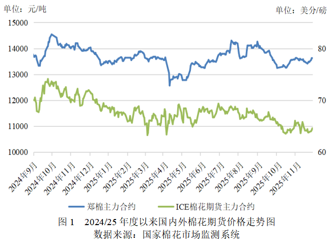 國內(nèi)市場方面,新棉迎來上市高峰,市場供應(yīng)保持充裕,下游紡織市場轉(zhuǎn)入淡季,基本面壓力上升。近期中美經(jīng)貿(mào)磋商取得積極進展,雙方明確自11月10日起互降關(guān)稅,為期1年,起到穩(wěn)定市場預(yù)期作用,國內(nèi)棉價總體保持震蕩走勢。截至11月27日,鄭州商品交易所棉花期貨主力合約結(jié)算價13635元/噸,與上月末持平;代表內(nèi)地標準級皮棉市場價格的國家棉花價格B指數(shù)14824元/噸,較上月上漲41元/噸,漲幅0.28%。內(nèi)外價差由上月末的2001元/噸擴大至2325元/噸。