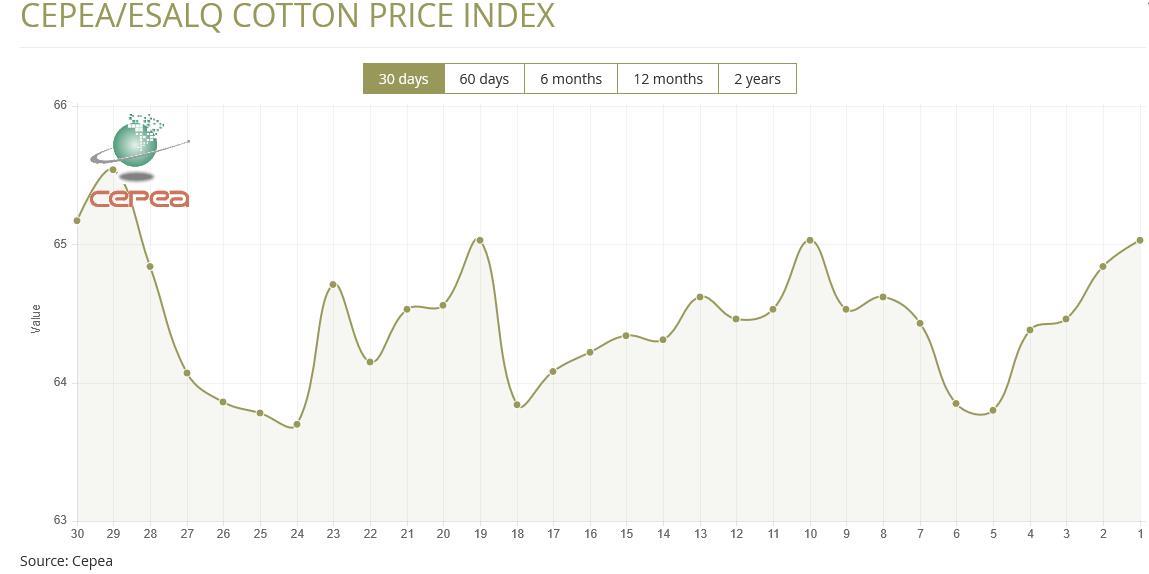 11月28日(周五),巴西CEPEA/ESALQ棉花價格指數報65.03美分/磅,較前一交易日上漲0.29%,較上月同期上漲0.73%。