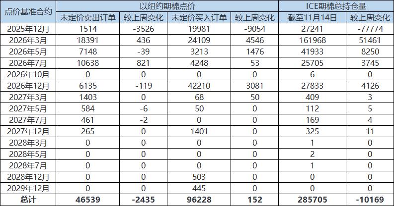 所有期棉合約點價未定價賣出訂單共46539手,較前周減少2435手。