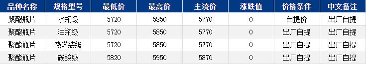 華東聚酯瓶片收于5770元/噸,漲跌值0元/噸,原油、原料持續(xù)上行動能不足,聚酯瓶片工廠多數(shù)持穩(wěn),市場重心僵持整理。12月貨源報盤5720-5850元/噸,遞盤5750-5770元/噸或期貨合約2602-60至平水,遞盤2602-80。