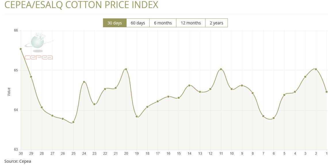 12月1日(周一),巴西CEPEA/ESALQ棉花價(jià)格指數(shù)報(bào)64.46美分/磅,較前一交易日下跌0.88%,較上月同期下跌0.88%。