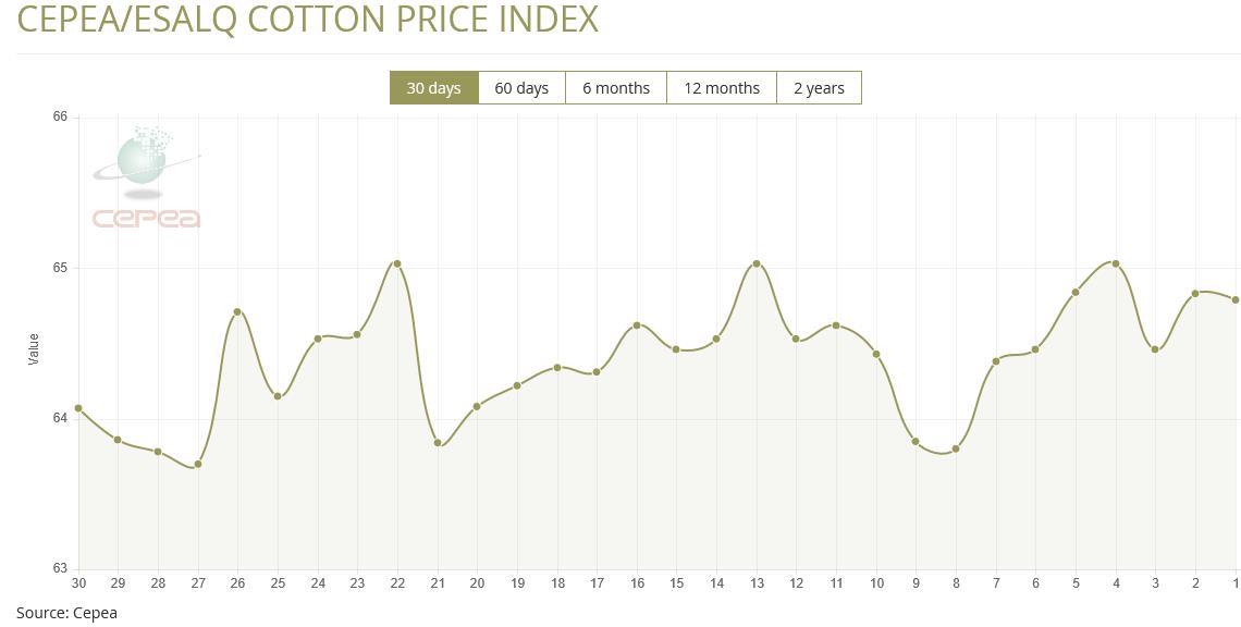 12月3日(周三),巴西CEPEA/ESALQ棉花價(jià)格指數(shù)報(bào)64.79美分/磅,較前一交易日下滑0.06%,較上月同期下跌0.37%。