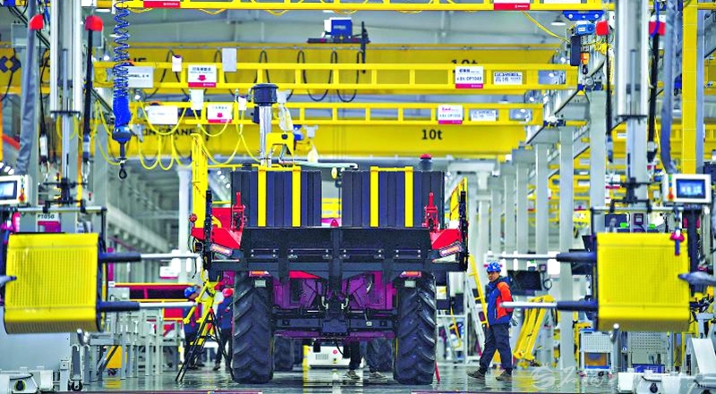 12月2日,工人在新疆缽施然智能農(nóng)機(jī)股份有限公司生產(chǎn)線上組裝采棉機(jī)。今年,該公司采棉機(jī)銷售量持續(xù)增長,國外訂單實(shí)現(xiàn)穩(wěn)定上升,產(chǎn)品銷往烏茲別克斯坦、哈薩克斯坦、阿塞拜疆等國。