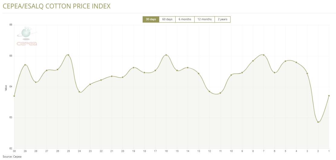 12月8日(周一),巴西CEPEA/ESALQ棉花價格指數(shù)報63.71美分/磅,較前一交易日上漲1.35%,較上月同期上漲2.03%。