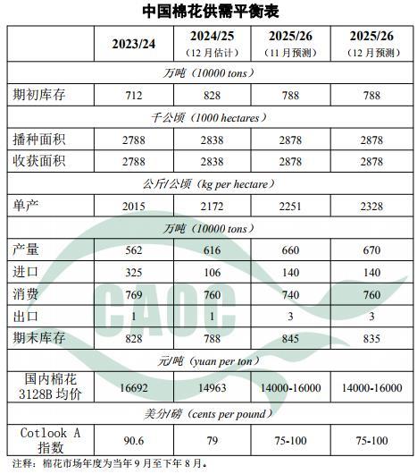 2025/26年度棉花采收基本結(jié)束,綜合棉花加工、銷售等數(shù)據(jù),實(shí)際產(chǎn)量有望好于預(yù)期。據(jù)中國(guó)棉花網(wǎng)數(shù)據(jù),截至12月4日,全國(guó)棉花加工率79.0%,同比增3.2個(gè)百分點(diǎn);銷售率37.3%,同比增21.9個(gè)百分點(diǎn)。據(jù)中國(guó)纖維質(zhì)量監(jiān)測(cè)中心數(shù)據(jù),截至12月7日,全國(guó)棉花檢驗(yàn)量493萬(wàn)噸,同比增長(zhǎng)14.9%。本月將2025/26年度單產(chǎn)上調(diào)至每公頃2328公斤,產(chǎn)量調(diào)增至670萬(wàn)噸。中美經(jīng)貿(mào)磋商取得重要成果,棉市信心有所恢復(fù),消費(fèi)量調(diào)增至760萬(wàn)噸。