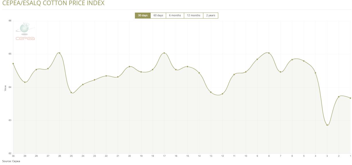 12月9日(周二),巴西CEPEA/ESALQ棉花價格指數(shù)報63.67美分/磅,較前一交易日下滑0.06%,較上月同期下滑2.09%。