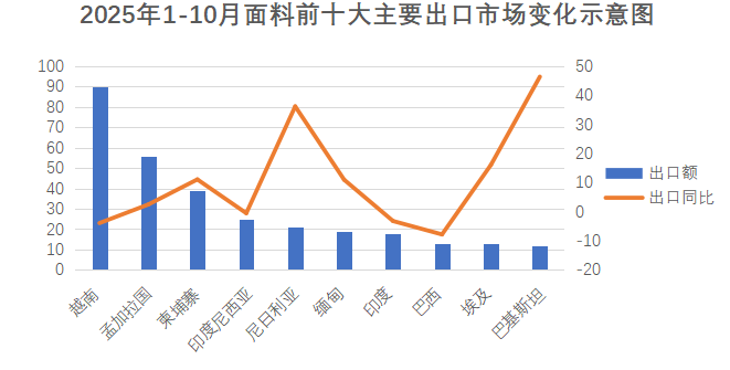 亞洲是我國面料出口的主要市場,2025年1-10月我國對亞洲國家出口面料379.5億美元,占面料出口總額的66.6%。在前十大目標市場出口中,亞洲市場占了7席。越南作為我國面料出口最大的單一市場,占我國面料對全球出口的15.7%,出口額89.6億美元,同比下降4.1%。