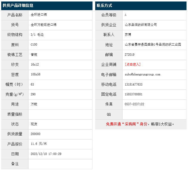 12月18日,山東圣潤(rùn)紡織有限公司環(huán)錠紡進(jìn)口棉純棉布C100 16x12 108x56 63" 3/1 毛邊 290g/㎡,報(bào)價(jià)為11.6元/米,實(shí)際成交價(jià)以協(xié)商為準(zhǔn)。[點(diǎn)擊查看詳情]
