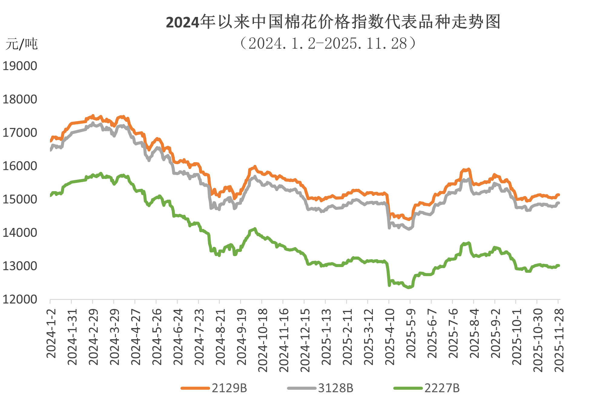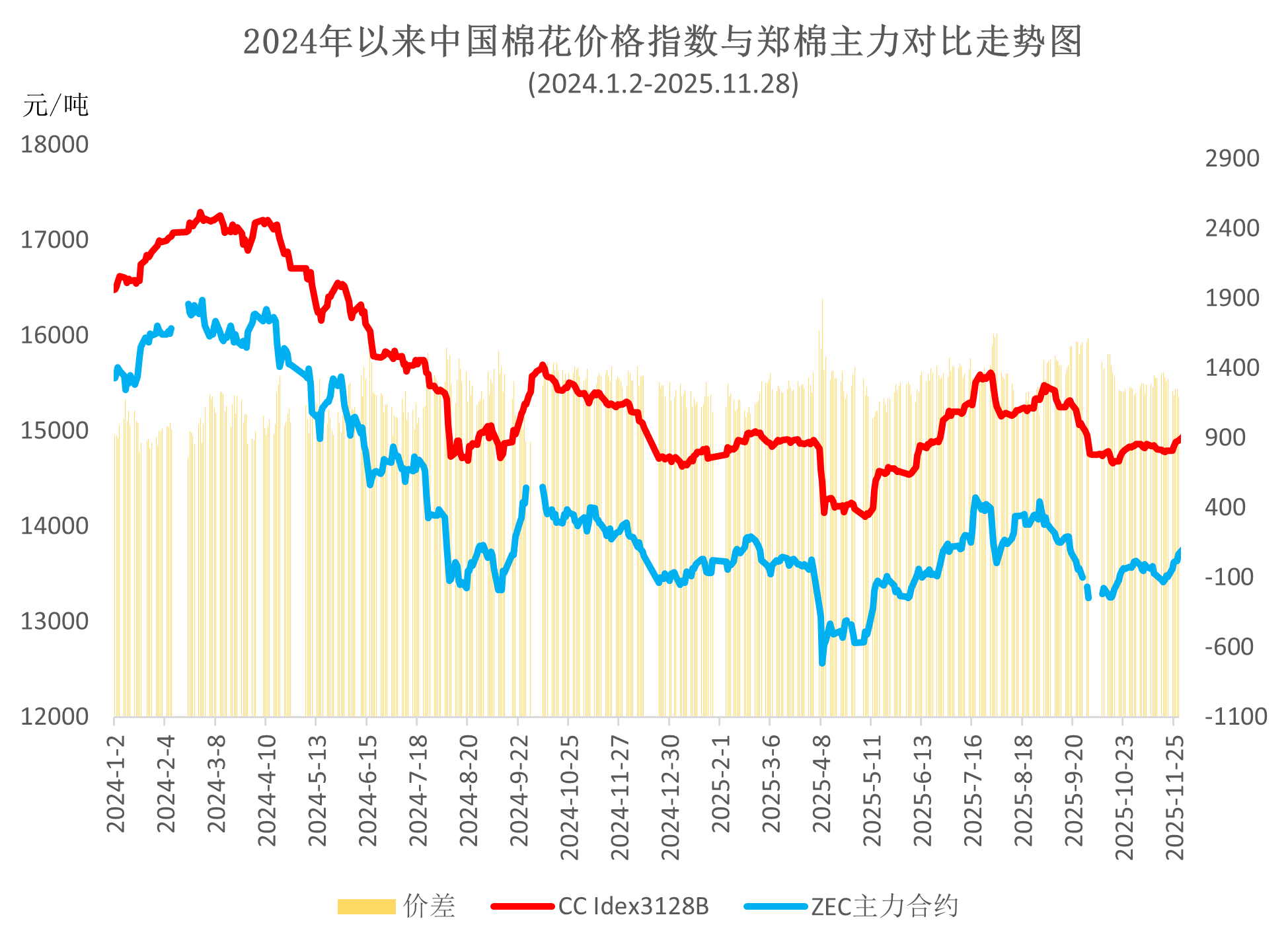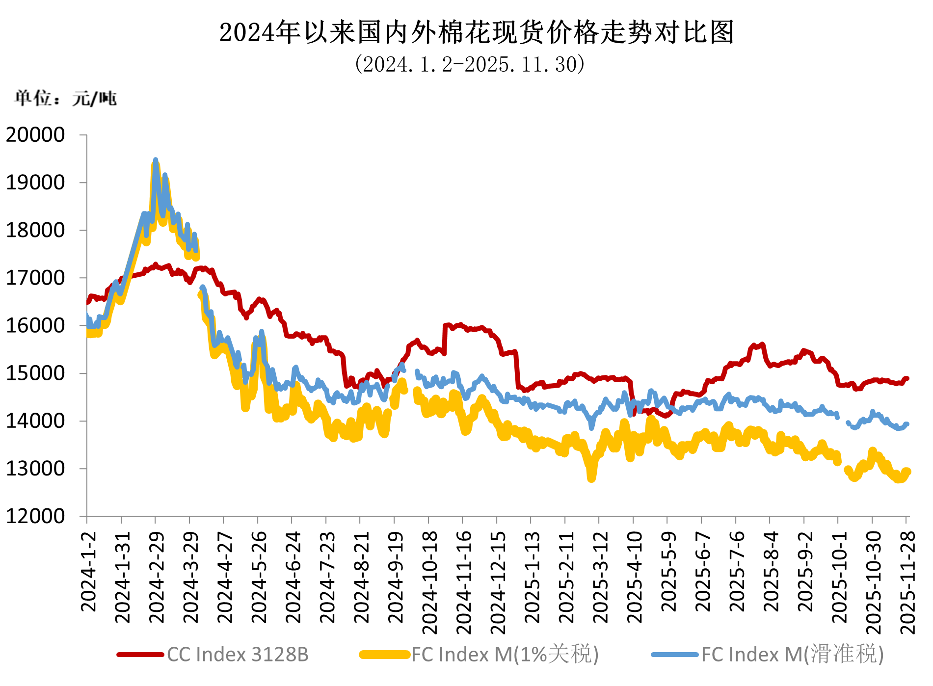 11月上中旬國內(nèi)新棉加工進(jìn)入高峰期,上市資源持續(xù)增加,市場供應(yīng)總體寬松,而紡織廠季節(jié)性需求下降,國內(nèi)現(xiàn)貨價(jià)格震蕩走弱,中國棉花價(jià)格指數(shù)由月初的14859元/噸下跌至最低14779元/噸。月下旬,相關(guān)部門聯(lián)合印發(fā)《關(guān)于增強(qiáng)消費(fèi)品供需適配性進(jìn)一步促進(jìn)消費(fèi)的實(shí)施方案》,加上中美元首通話顯示兩國關(guān)系總體穩(wěn)定向好,帶動(dòng)市場信心回升,國內(nèi)棉價(jià)持續(xù)反彈,中國棉花價(jià)格指數(shù)月底收于最高點(diǎn)14896元/噸,月均價(jià)14831元/噸,環(huán)比上漲67元,同比下跌497元。