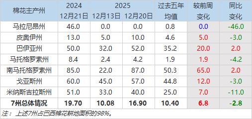 12月22日(周一),巴西國(guó)家商品供應(yīng)公司(Conab)公布的數(shù)據(jù)顯示,截至2025年12月20日當(dāng)周,2025/26年度巴西棉花種植率為16.9%,前周為10.1%,上年同期為19.7%,五年均值為10.4%。