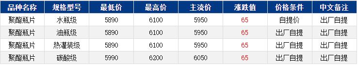 華東聚酯瓶片收于5950元/噸,漲跌值65元/噸,原料強勢推動,聚酯瓶片重心繼續(xù)上揚,12-1月貨源報盤5880-6100元/噸,遞盤5900-5950元/噸。