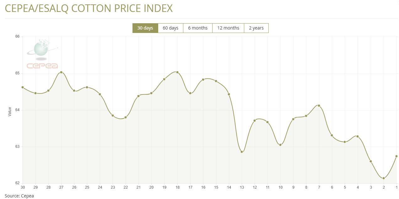 12月23日(周二),巴西CEPEA/ESALQ棉花價(jià)格指數(shù)報(bào)62.74美分/磅,較前一交易日上漲0.97%,較上月同期下滑3.52%。