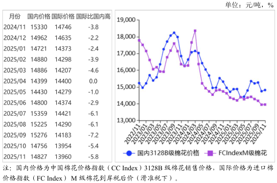 【后期走勢】國內市場:新棉采收基本結束,市場供應量增加。紡織市場進入傳統(tǒng)淡季,但中美經貿關系緩和提振消費預期,預計棉價以穩(wěn)為主。國際市場:北半球新棉集中上市,棉花供應寬松。全球經濟復蘇乏力,主要紡織品服裝進口國消費低迷,國際棉價仍有下行壓力。