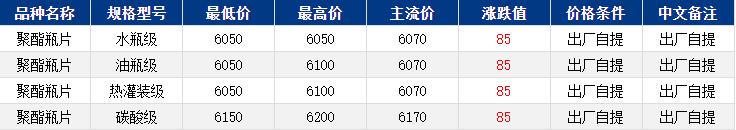華東聚酯瓶片收于6070元/噸,漲跌值85元/噸,PTA某300萬噸裝置因故障停車,原料再度拉漲至階段內(nèi)高位。成本推動下,聚酯瓶片工廠報(bào)價上調(diào),重心隨之上揚(yáng)。12-1月貨源報(bào)盤6050-6100元/噸,遞盤6040元/噸;2-3月貨源報(bào)盤6070-6120元/噸,遞盤6070元/噸,觀望情緒濃厚,實(shí)單遞盤零星。
