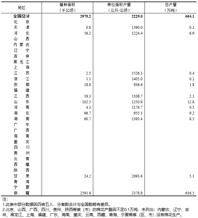 全國棉花總產(chǎn)量為31個省(區(qū)、市)棉花產(chǎn)量的總和。