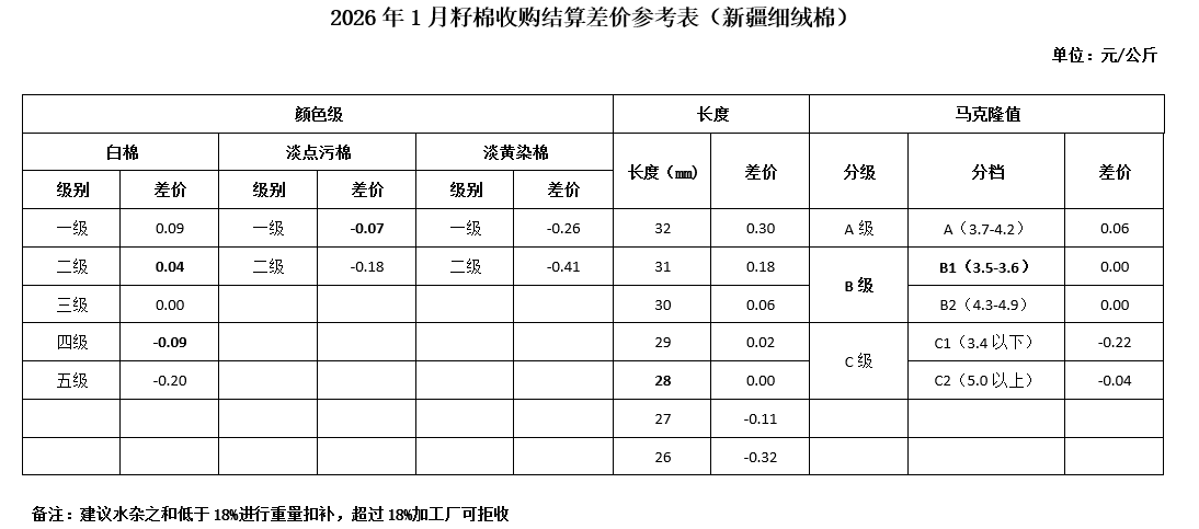 依據(jù)中國棉花協(xié)會發(fā)布的2026年1月《鋸齒加工細絨棉質量差價表》和2025年9-12月新疆籽棉平均公定衣分率,折算得出籽棉收購差價,與上月相比,做如下調整: