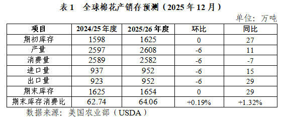 本期將中國(guó)棉花產(chǎn)銷存預(yù)測(cè)表中2025/26年度產(chǎn)量較上期下調(diào)2萬噸、消費(fèi)量上調(diào)16萬噸、期末庫存下調(diào)18萬噸、期末庫存消費(fèi)比下調(diào)3.67個(gè)百分點(diǎn)。
