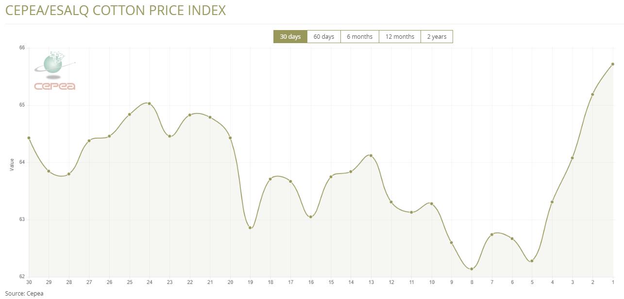 1月6日(周二),巴西CEPEA/ESALQ棉花價(jià)格指數(shù)報(bào)65.72美分/磅,較前一交易日上漲0.81%,較上月同期上漲3.81%。