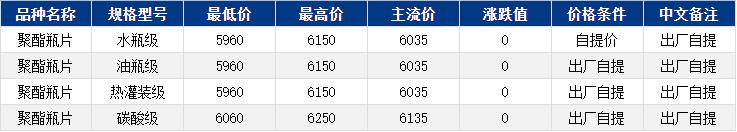 華東聚酯瓶片收于6035元/噸,漲跌值0元/噸,原油繼續(xù)下跌,原料寬幅震蕩,聚酯瓶片工廠報價多上調(diào)20-30元/噸,重心區(qū)間震蕩。1月貨源報盤5960-6150元/噸或期貨合約2603貼水40至升水100,外圍不確定因素較多,業(yè)內(nèi)觀望情緒濃厚。實單遞盤5990-6030元/噸。