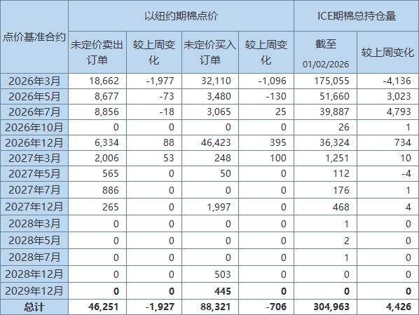 2026年1月8日(周四),美國商品期貨交易委員會(CFTC)公布,截至2026年1月2日,以ICE期棉2026年3月合約點(diǎn)價(jià)未定價(jià)賣出訂單(UnfixedCallSales)較前周減少1977手至18662手。