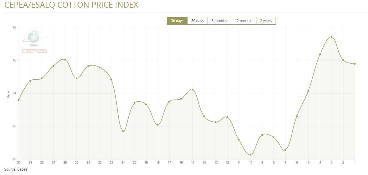 1月8日(周四),巴西CEPEA/ESALQ棉花價格指數(shù)報64.90美分/磅,較前一交易日下跌0.18%,較上月同期上漲2.51%。