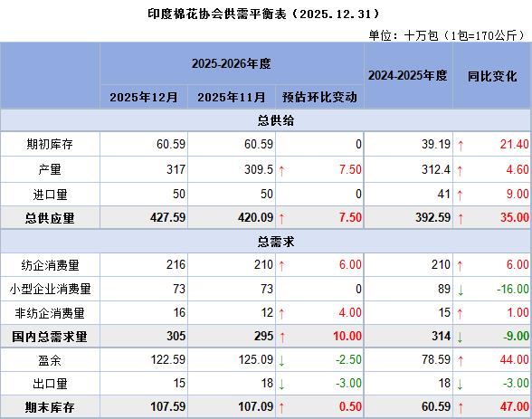 CAI主席VinayKotak在一份聲明中表示,預計截至9月的當前2025/26年度棉花消費量為3050萬包,略低于上一年度的3140萬包。截至12月底,消費量估計為762.5萬包。政府提供的截至去年12月31日的免稅進口窗口促使貿(mào)易商和工廠進口310萬包。