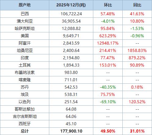 據海關統(tǒng)計數(shù)據,2025年12月我國進口棉花約18萬噸,環(huán)比增加約6萬噸,同比增長約31.0%。