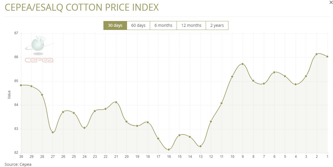 1月16日(周五),巴西CEPEA/ESALQ棉花價(jià)格指數(shù)報(bào)66.03美分/磅,較前一交易日下跌0.15%,較上月同期上漲4.30%。