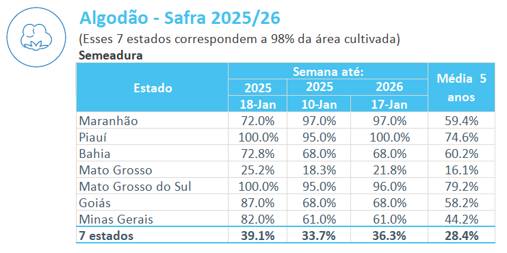 據(jù)巴西農(nóng)業(yè)部下屬的國家商品供應公司CONAB,截至1月17日,巴西棉花播種率為36.3%,上周為31.9%,去年同期為39.1%,五年均值為28.4%。