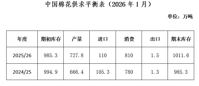 美國(guó)農(nóng)業(yè)部(USDA)1月供需報(bào)告顯示,2025/26年度全球棉花產(chǎn)量下調(diào)至2600.3萬(wàn)噸,消費(fèi)量上調(diào)至2589.2萬(wàn)噸,調(diào)整方向偏多;其中美棉產(chǎn)量下調(diào)至303.1萬(wàn)噸,環(huán)比調(diào)減2%。
