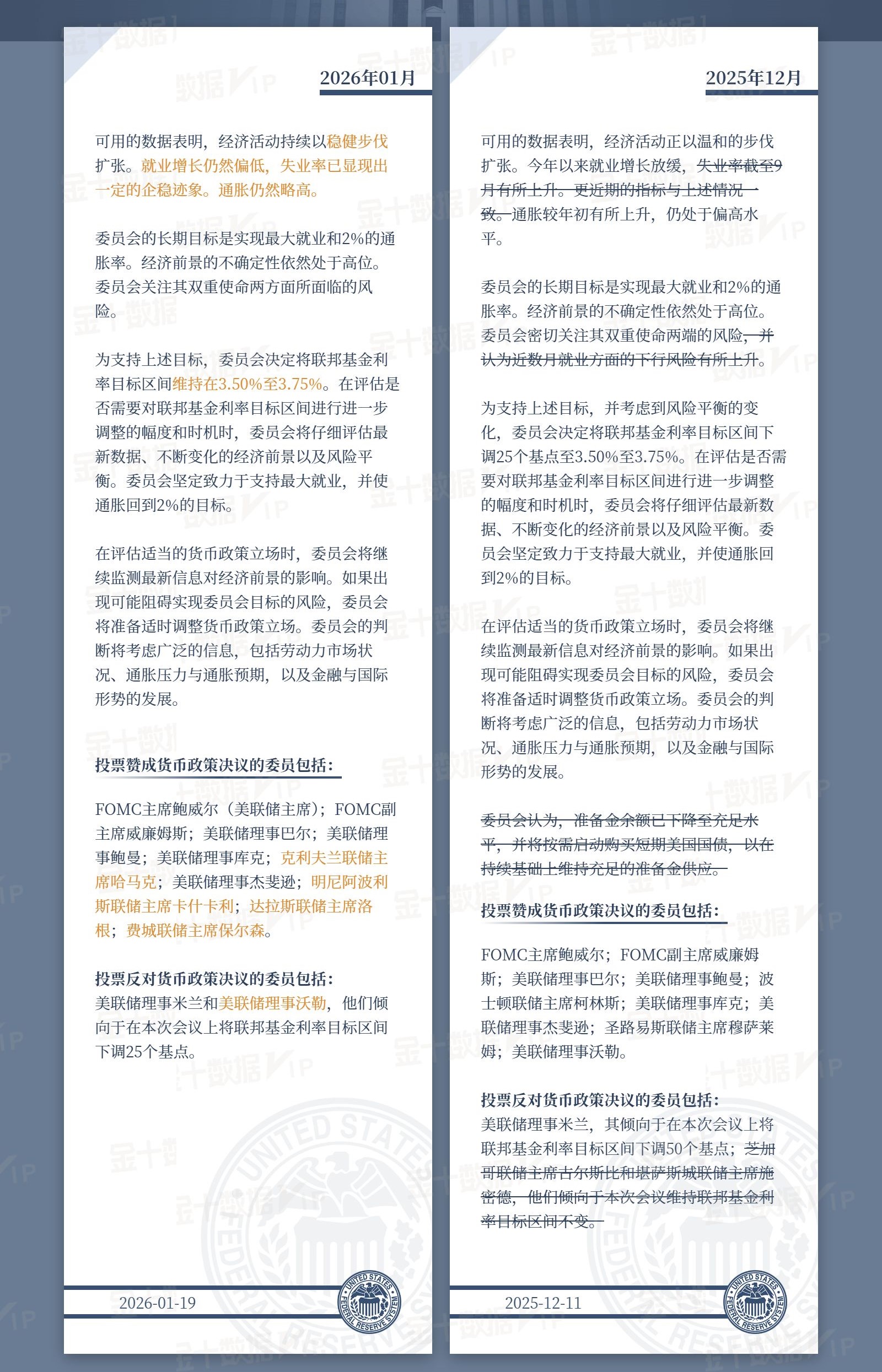 公告顯示,聯(lián)邦公開(kāi)市場(chǎng)委員會(huì)12名成員中,支持當(dāng)日貨幣政策會(huì)議決定的有10人,投反對(duì)票的是美聯(lián)儲(chǔ)理事斯蒂芬·米蘭、克里斯托弗·沃勒,2人主張降息25個(gè)基點(diǎn)。