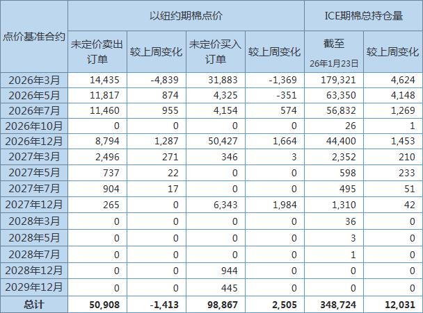 1月29日(周四),美國(guó)商品期貨交易委員會(huì)(CFTC)公布,截至1月23日,以ICE期棉2026年3月合約點(diǎn)價(jià)未定價(jià)賣出訂單(UnfixedCallSales)較前周減少4839手至14435手。