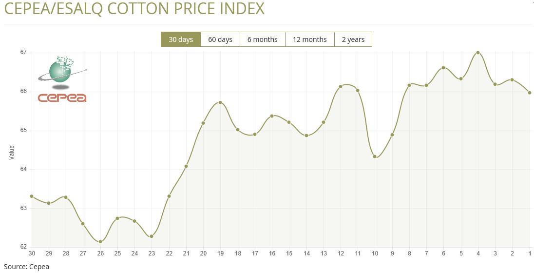 1月30日(周五),巴西CEPEA/ESALQ棉花價格指數(shù)報65.97美分/磅,較前一交易日下滑0.50%,較上月同期上漲4.20%。