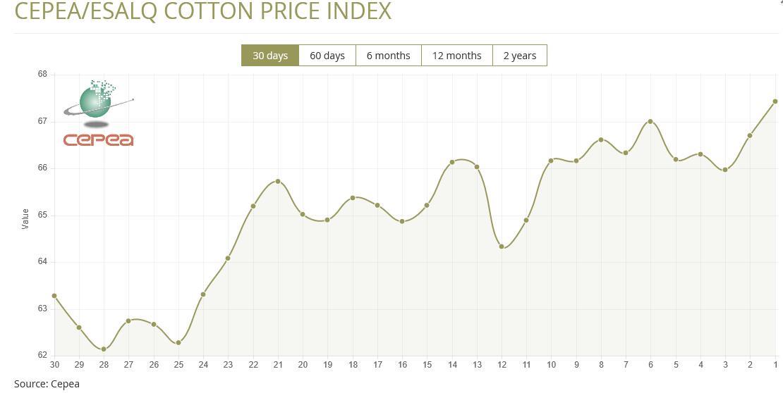 2月3日(周二),巴西CEPEA/ESALQ棉花價(jià)格指數(shù)報(bào)67.43美分/磅,較前一交易日上揚(yáng)1.09%,較上月同期上漲2.21%。