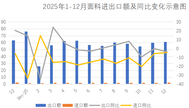 全年看,我國(guó)紗線面料出口實(shí)現(xiàn)小幅正增長(zhǎng),進(jìn)口呈大幅下滑態(tài)勢(shì),但12月進(jìn)口小幅增長(zhǎng),出口持續(xù)下降,凸顯后期外貿(mào)面臨的不確定性,整體形勢(shì)呈“全年穩(wěn)增、單月承壓、進(jìn)口收縮”的鮮明特征。