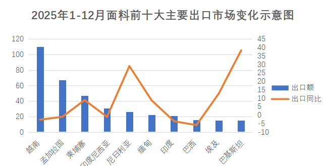 亞洲是我國(guó)面料出口主要市場(chǎng),2025年1-12月我國(guó)對(duì)亞洲國(guó)家出口面料460.3億美元,占面料出口總額的66.6%。在前十大目標(biāo)市場(chǎng)出口中,亞洲市場(chǎng)占了7席。越南作為我國(guó)面料出口最大的單一市場(chǎng),占我國(guó)面料對(duì)全球出口的15.9%,出口額110億美元,同比下降2.7%。