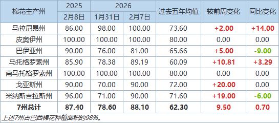 2月9日(周一),巴西國家商品供應(yīng)公司(Conab)公布的數(shù)據(jù)顯示,截至2月7日當周,2025/26年度巴西棉花種植率為88.1%,前周為78.6%,上年同期為87.4%,五年均值為62.3%。
