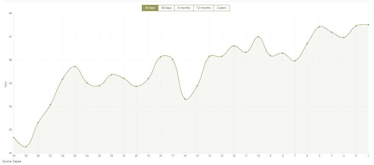 2月9日(周一),巴西CEPEA/ESALQ棉花價(jià)格指數(shù)報(bào)67.52美分/磅,較前一交易日上漲0.07%,較上月同期上漲2.35%。