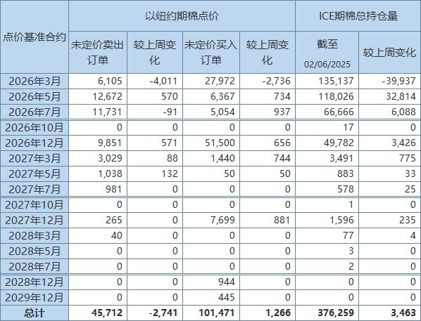 所有期棉合約點價未定價賣出訂單共45712手,較前周減少2741手。