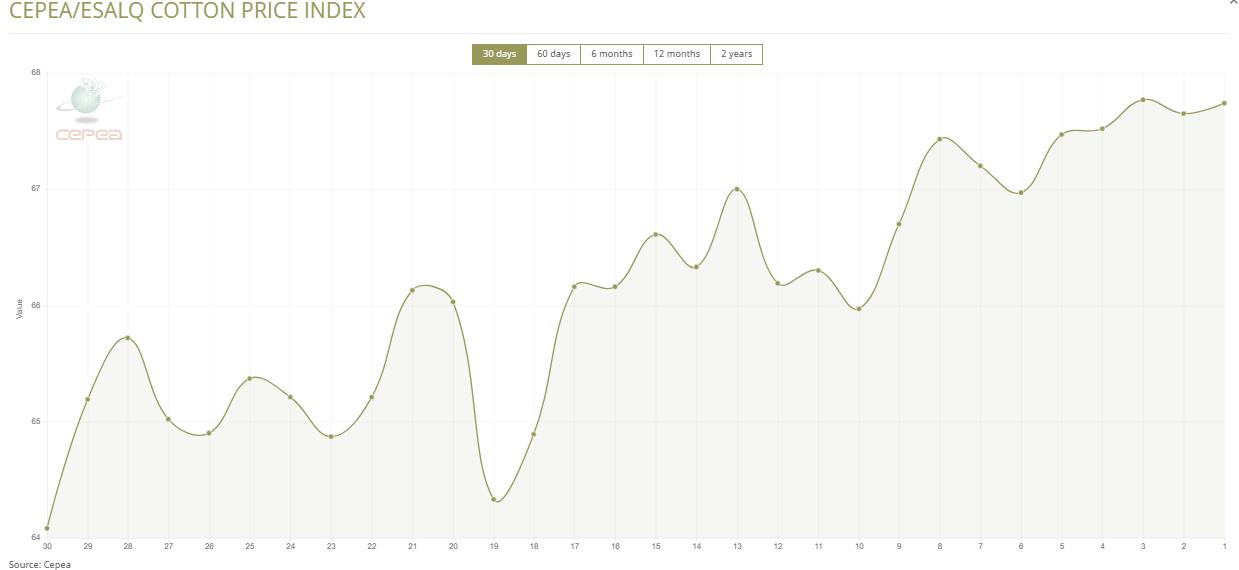 2月12日(周四),巴西CEPEA/ESALQ棉花價(jià)格指數(shù)報(bào)67.74美分/磅,較前一交易日上漲0.13%,較上月同期上漲2.68%。