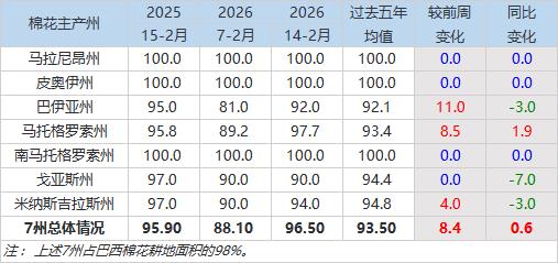 2月16日(周一),巴西國(guó)家商品供應(yīng)公司(Conab)公布的數(shù)據(jù)顯示,2025/26年度巴西棉花種植率為96.5%,前周為88.1%,上年同期為95.9%,五年均值為93.5%。