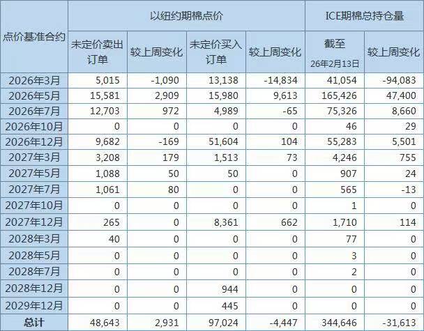 2月19日(周四),美國商品期貨交易委員會(CFTC)公布,截至2月13日,以ICE期棉2026年3月合約點價未定價賣出訂單(Unfixed Call Sales)較此前周減少1090手至5015手。